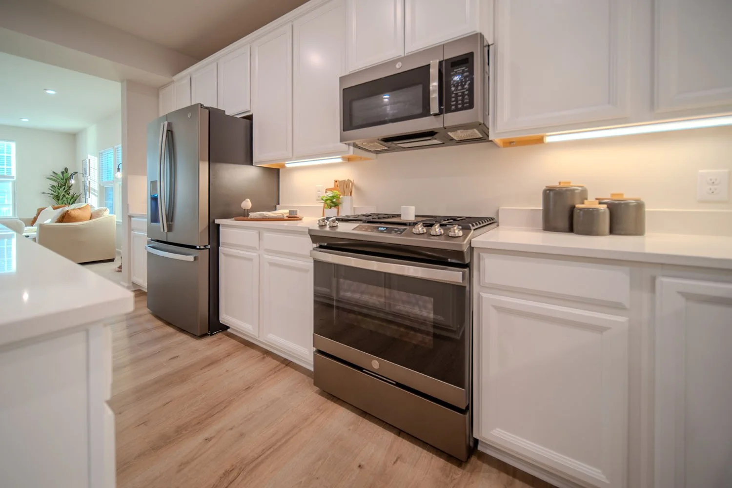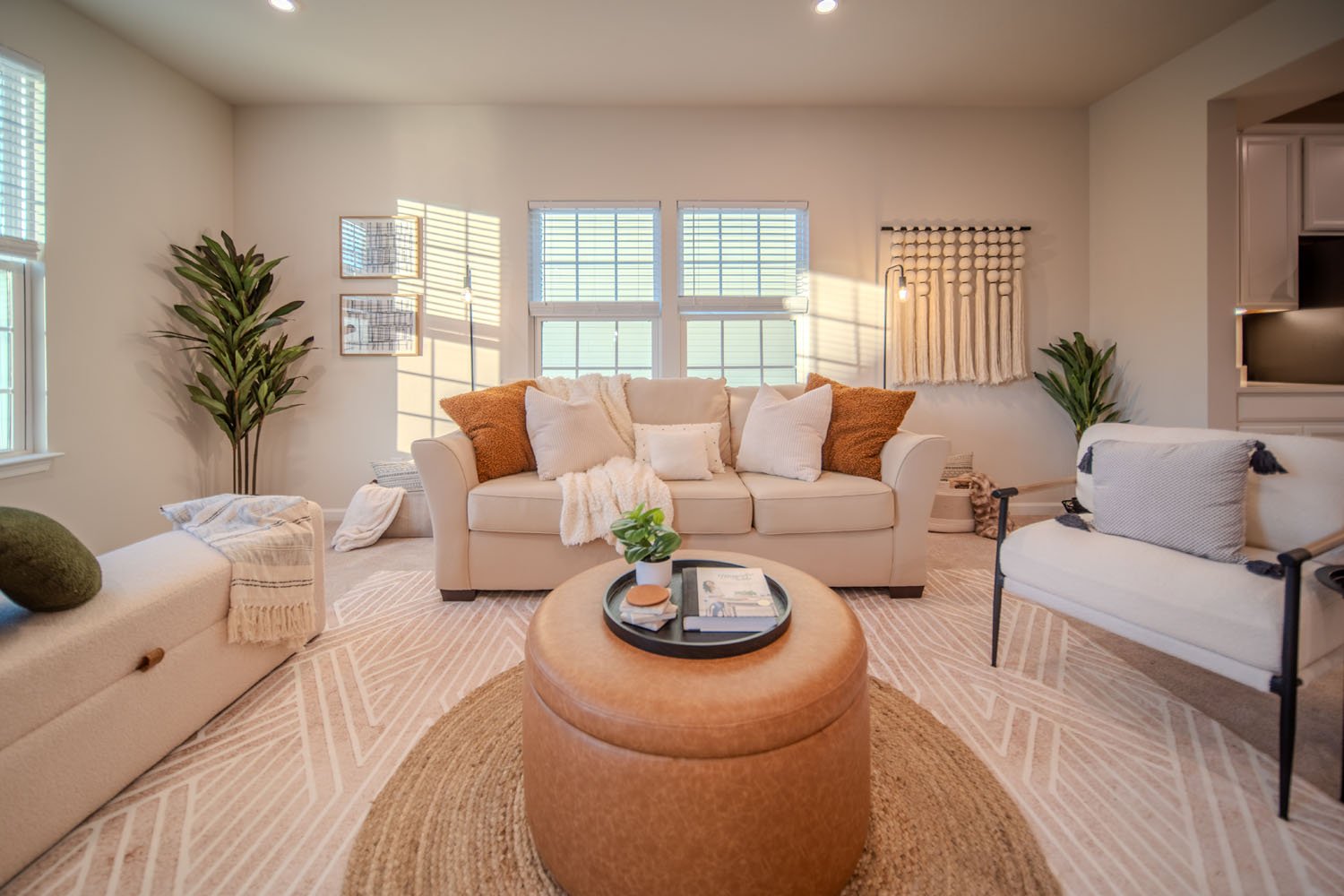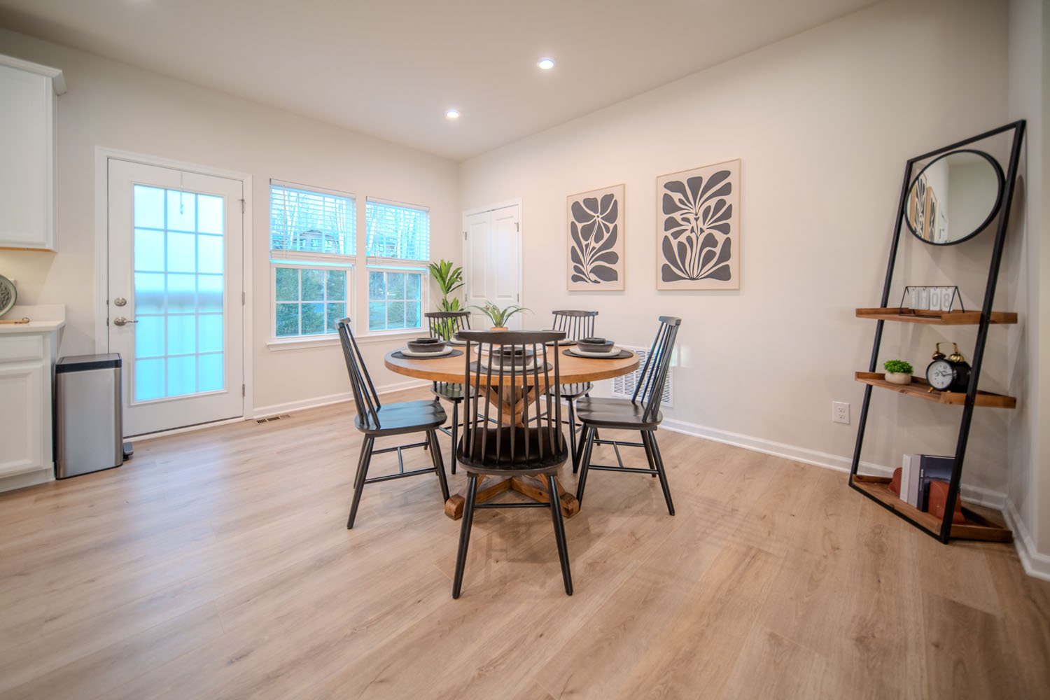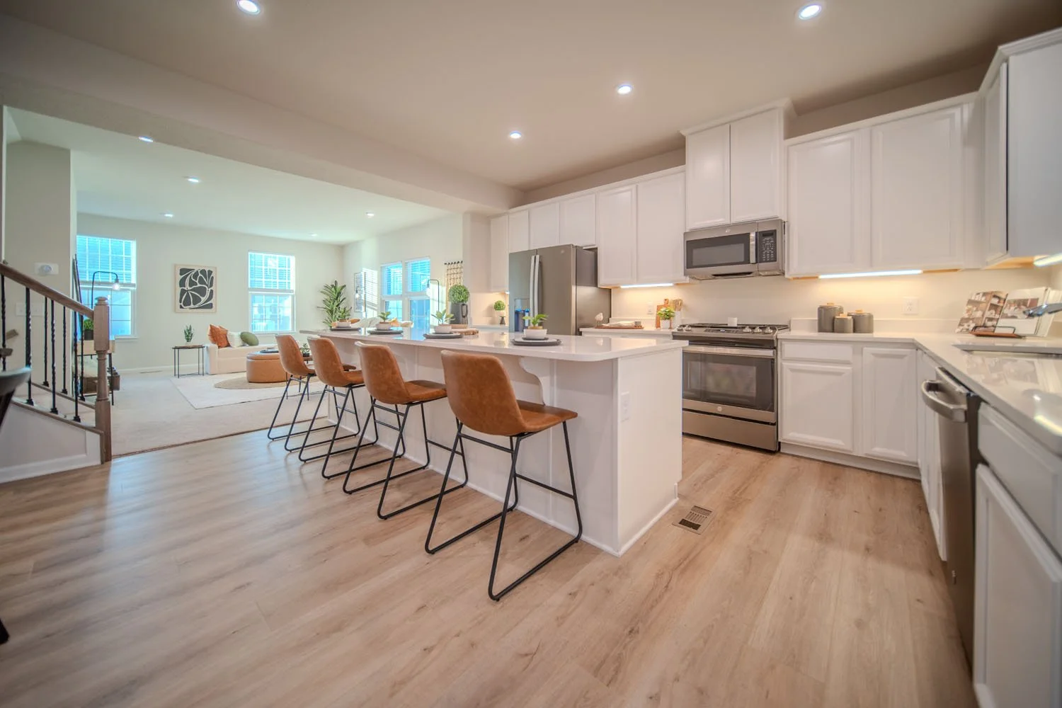 - Dining and living areas flow seamlessly from the kitchen